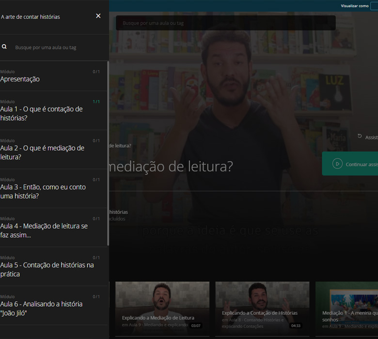 Além disso, o curso traz referências bibliográficas para formação de repertório e vídeos de apresentações públicas de contação de histórias e mediação de leitura, com explicações detalhadas do trabalho e das técnicas utilizadas.